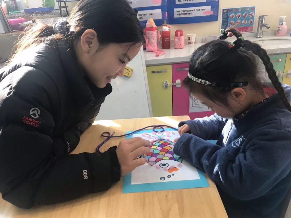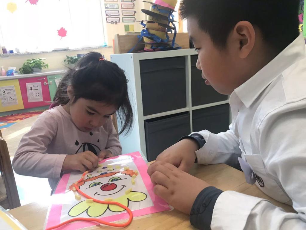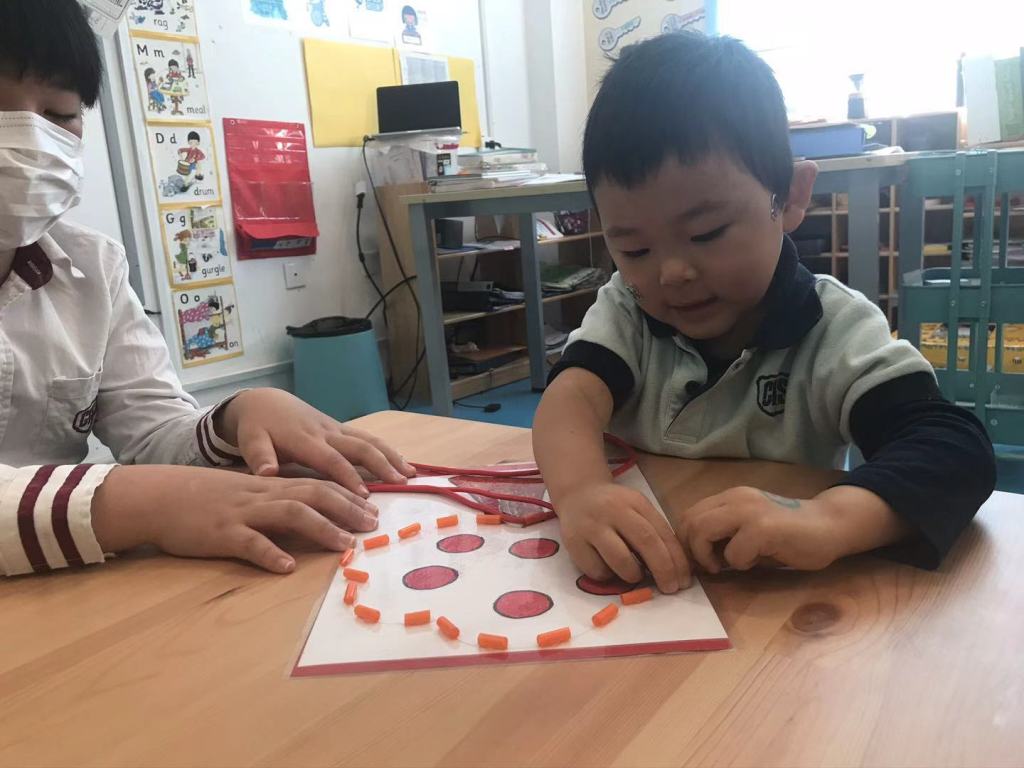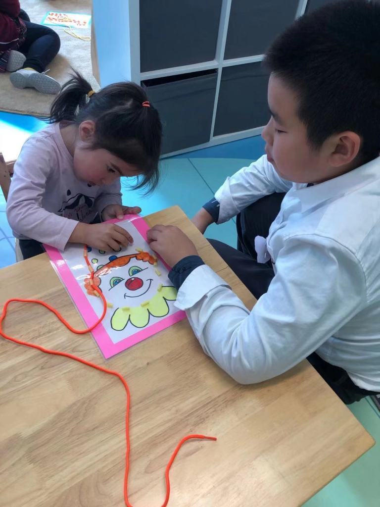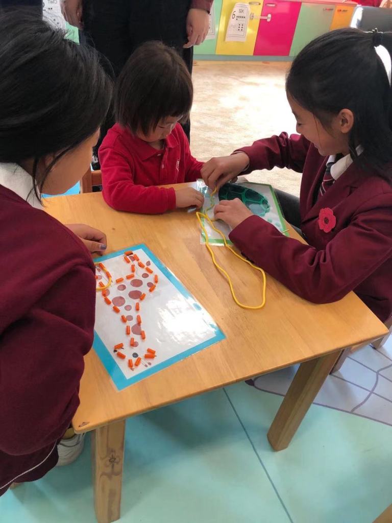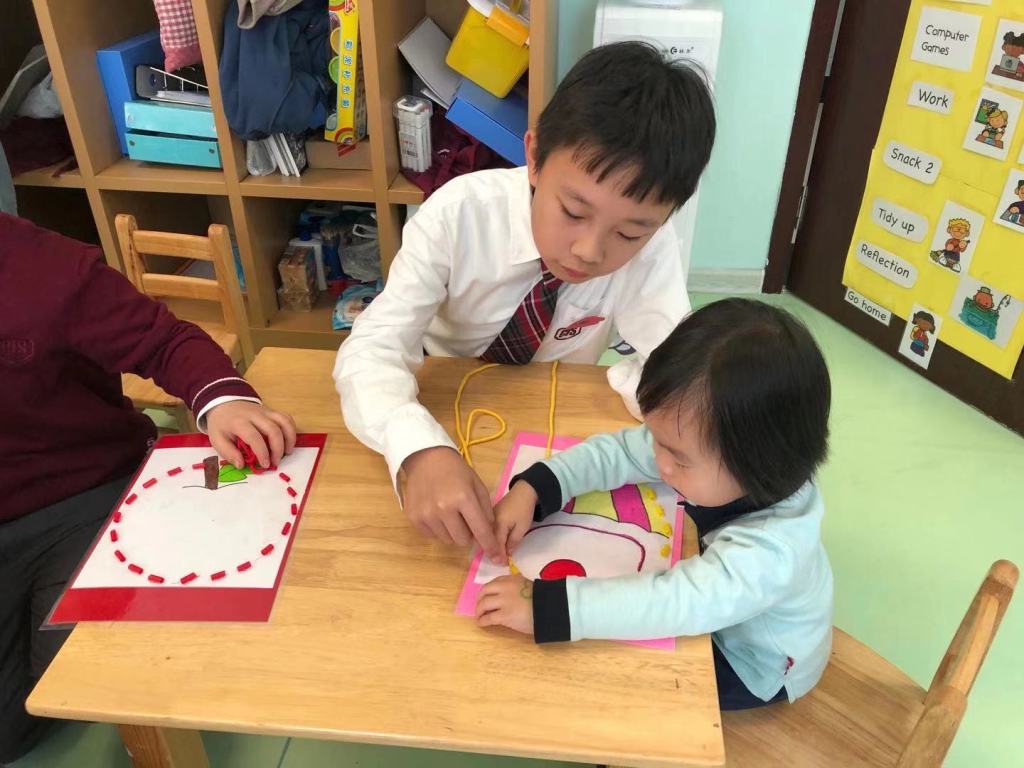 The Grade 5 students then took their picture down to the kindergarten class and did the activity together with them. Using a shoelace, the kindergarten children practised their fine-motor skills to thread the shoelace around the picture to complete it.