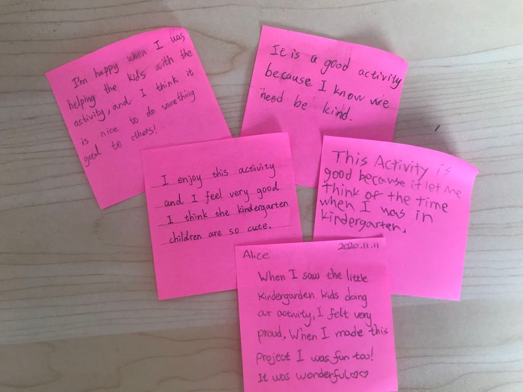 This was enjoyed by all students – big and small! The reflection written by the Grade 5 students indicated that they enjoyed the activity and they went down memory lane and told stories of their lives in kindergarten.