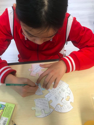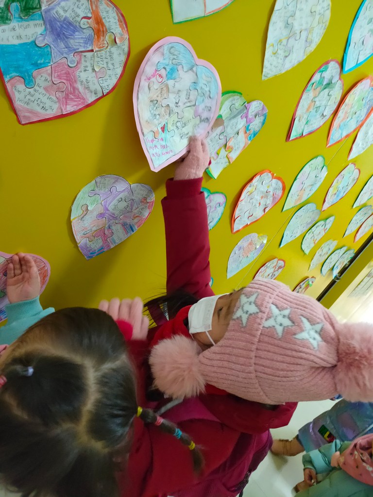 Then, every student, back with their Homeroom Teacher, had to complete their “Hearty” Puzzle by adding to the collected pieces one piece with their name and grade, and another one with a personal reflection about the activity.