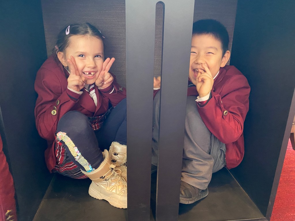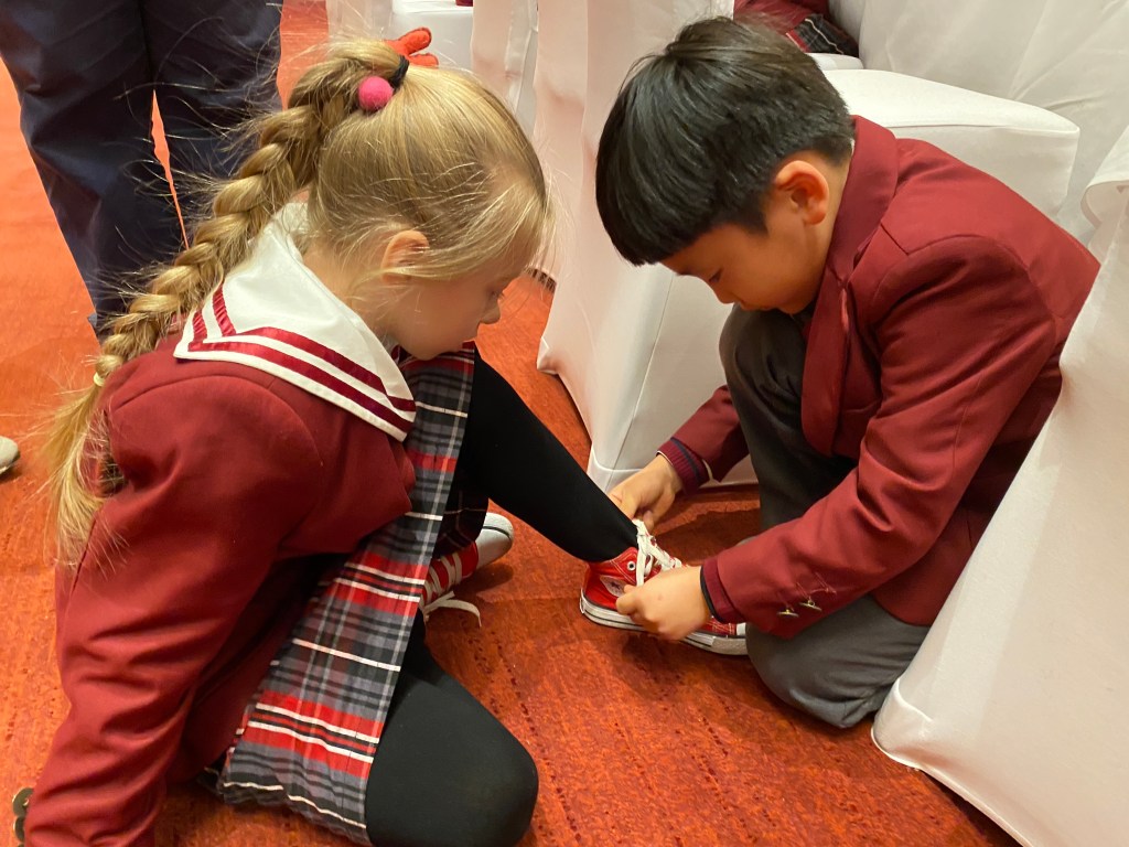 I helped Ms. Ahktar, the changing room was full of elves. “Please fold your costumes, don’t lose them” said Ms. Ahktar. Her superpower is her patience and calmness. I helped Ms. Ahktar to put the children’s things on. Five minutes of quiet.