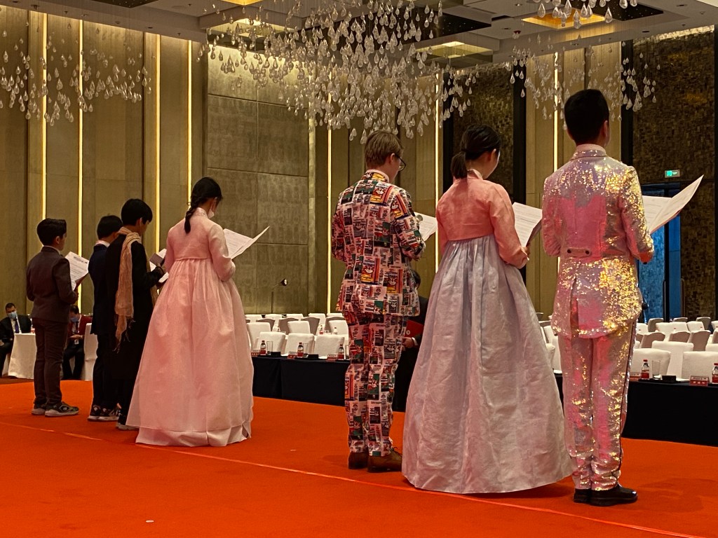 Ms. Ghazala Sajid and I had to welcome Dr. Pang, Mr. Prescott, Madame Duan, and other distinguished members of the community. Ms. Ghazala was perfect for the assignment. She wore her traditional Pakistani gold dress. After, I had to go to my other role in the locker room. Ms. Sun Siwen had many powers. She could make thing appear instantaneously – thermometers, flags, and, coffee, she made sure guests were welcomed in a way that made them excited for the evening, and made sure the little masters of ceremony were prepared and ready to take the stage.